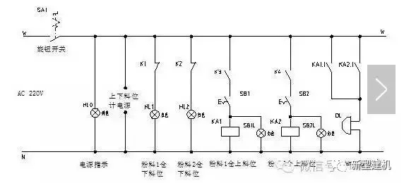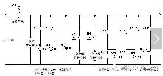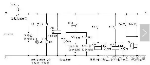 控制說明:打開旋鈕開關SA1后,各倉下料位計電源一直接通,物料倉中物料的下料位處于監(jiān)控狀態(tài)(同圖1控制方式)。當向粉料1倉上料時,壓力開關SP1檢測到壓力后常開觸點閉合,此時粉料1倉上料位計電源接通,上料位處于監(jiān)控狀態(tài),若粉料1倉中物料到達上料位,其料位計的常開觸點K3閉合,粉料1倉上料位指示燈SB1亮,繼電器KA1通電,其常開觸點KA1.1閉合,聲光電鈴DL通電報警,提示粉料1倉物料已到上限位,不可再注入粉料。當上料完畢后,上料管道中壓力減小至大氣壓,壓力開關SP1復位,其常開觸點斷開,自動關閉上料位計電源。