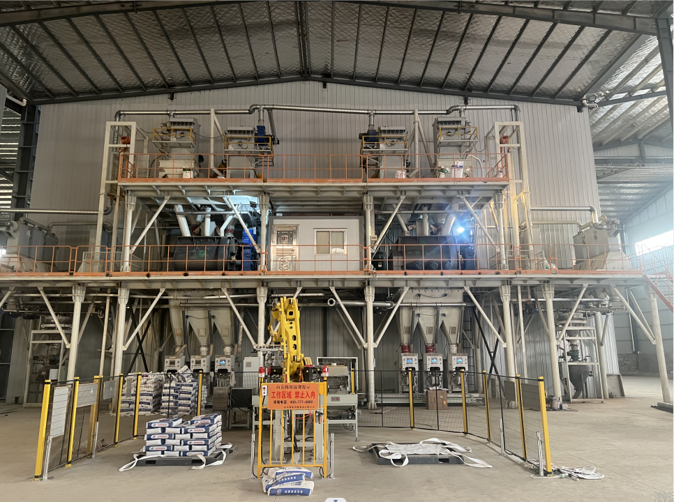 年產(chǎn)三十萬噸普通干粉砂漿生產(chǎn)線+塔樓式精品機(jī)制砂生產(chǎn)線,塔樓式結(jié)構(gòu),機(jī)制樓采用VK100型制砂機(jī)、變頻懸浮式風(fēng)選機(jī)。全自動(dòng)機(jī)械手包裝碼垛,智能化操作。